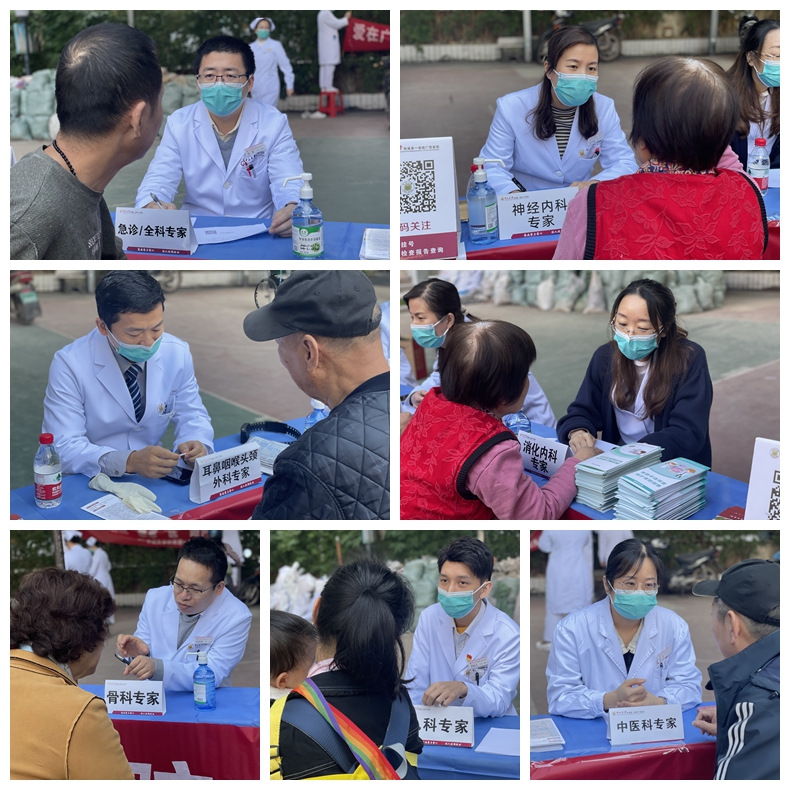 本次义诊活动由皇冠足球投注网 耳鼻咽喉头颈外科、骨科、中医科、神经内科、消化内科、儿科、急诊科专家及护理工作人员共16人组成。活动吸引了很多社区居民参与,不少居民甚至早早就在现场等候。
