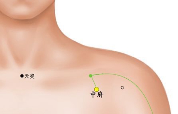 1、中府穴:位置在锁骨外侧下缘凹陷处再往下1横指处,中府穴为肺经的募穴,可治疗咳嗽、气喘等问题。