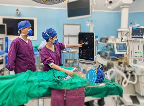 手术开始前,房洁渝和手术麻醉中心赖昱丞主治医生首先使用小剂量镇静药物联合泵注血管活性药,稳定梁阿姨的生理状态,然后进行腰硬联合麻醉,逐步调整麻醉平面,最终精准地将麻醉平面控制在胸10平面(平脐),如此一来,既能满足手术要求,又能降低对患者循环系统的影响。此外,房洁渝团队还通过运用心脏超声对手术全程进行实时监测,查看患者心功能情况,确保手术顺利进行。