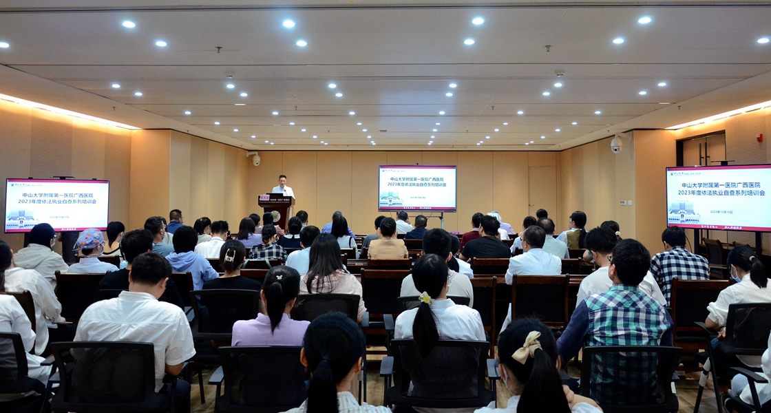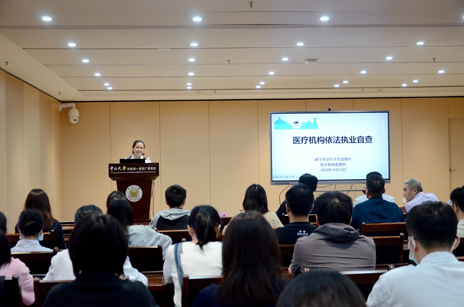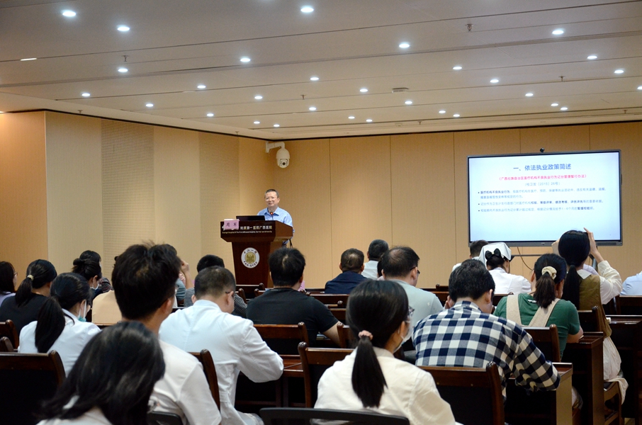 为深入贯彻落实医疗机构依法执业自我管理主体责任,增强医务人员法治意识,规范从业行为,提高医疗服务质量和安全,10月19日、23日,皇冠足球投注网 (自治区人民医院医院)(简称皇冠足球网 )举办2023年度依法执业自查系列培训会。皇冠足球投注网 党委书记张国、副院长夏文豪及相关临床、医技、职能科室医护人员参加。培训会邀请了自治区卫生监督所监督四科科长/四级调研员周军,南宁市卫生计生监督所医疗机构监督科科长冯云新、陈丹,自治区人民医院医疗管理科李思华进行授课。培训会由夏文豪主持。