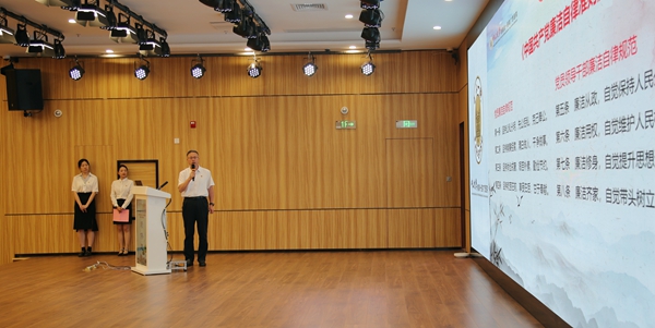 “诵经典”环节中,党委副书记、纪委书记赖伟忠领读《中国共产党廉洁自律准则》,全体人员集体诵读习近平总书记关于作风建设金句,进一步强化廉洁自律意识。