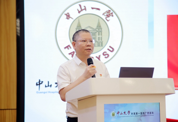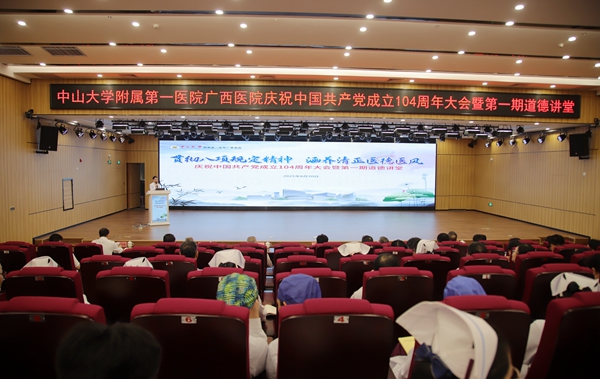 为庆祝中国共产党成立104周年,深入贯彻中央八项规定精神学习教育,涵养清正医德医风,6月30日,中山大学附属第一医院(简称中山一院)广西医院在八月会议中心举行庆祝中国共产党成立104周年大会暨第一期道德讲堂活动。医院党委书记张国、执行院长李健等党政领导班子成员,党委委员、纪委委员及各科室中层干部、各党支部和团支部代表等参加活动。
