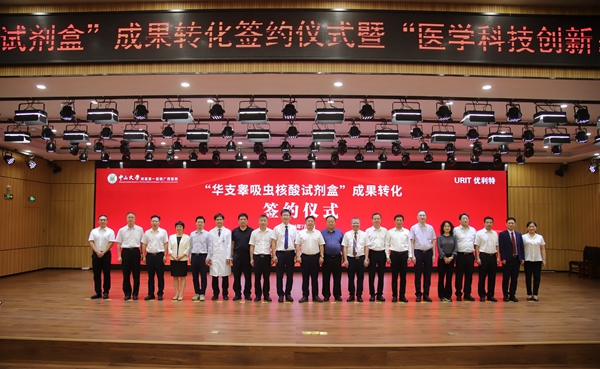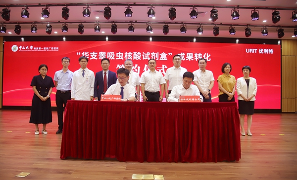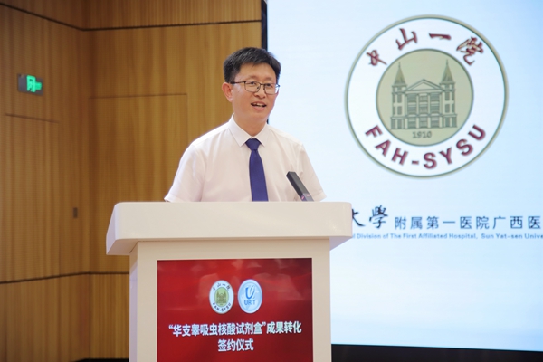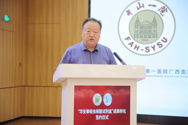 7月9日,“华支睾吸虫核酸试剂盒”成果转化签约仪式在中山大学附属第一医院(简称中山一院)广西医院八月会议中心举行,自治区卫生健康委党组成员、副主任周恭伟,自治区市场监管局二级巡视员杨晓东,自治区疾病预防控制局党组成员、副局长王盛,自治区卫生健康委科技教育处处长庞清,自治区疾病预防控制局卫生免疫处处长王华,皇冠足球网 执行院长李健、党委书记张国及医院领导班子,桂林优利特医疗电子有限公司董事长石平及相关代表等出席。签约仪式由皇冠足球网 党委书记张国主持。