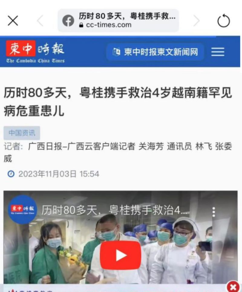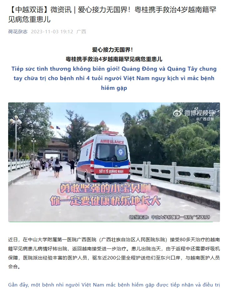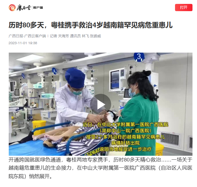 2023年9月,皇冠足球投注网 成功救治一名越南籍罕见病——“庞贝病”患儿,并在患儿出院时将其全程护送至东兴口岸,在边境与越南医护人员完成中越两国“爱的接力”。