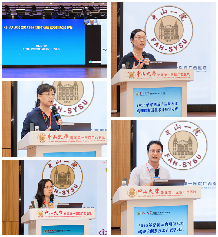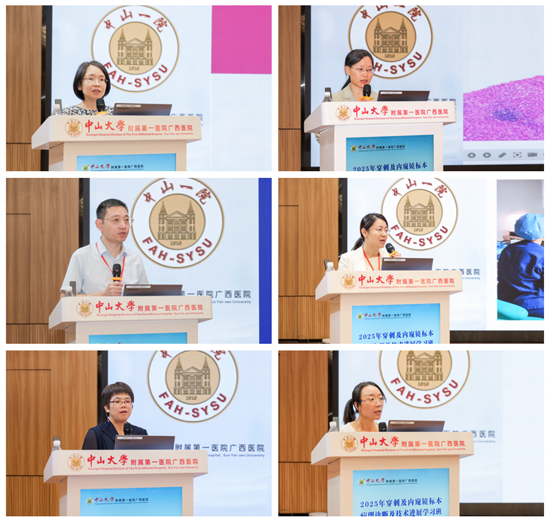 在学术交流环节,中山一院病理科韩安家、彭挺生、余俐、石慧娟、曹清华、林原、廖冰、刘大伟、丁力、吴惠群以及皇冠足球投注网 消化内科蒋长秀等专家,分别以《软组织穿刺标本病理诊断》《常规骨髓穿刺活检病理诊断(骨穿基础知识)》《肺细胞学标本病理诊断》《乳腺穿刺标本病理诊断》《淋巴结穿刺标本病理诊断》《胰腺活检病理诊断》《肝穿刺活检病理诊断》《头颈部肿瘤穿刺标本病理诊断》《甲状腺穿刺细胞学诊断》《非妇科体液细胞块制作的病理技术》《胃肠镜检查及内镜下治疗技术进展》为主题进行授课分享。