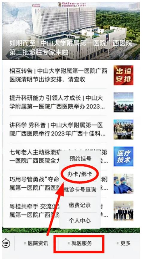 3、尚未办理就诊卡的患者,在微信公众号选择“就医服务”—“办卡绑卡”。