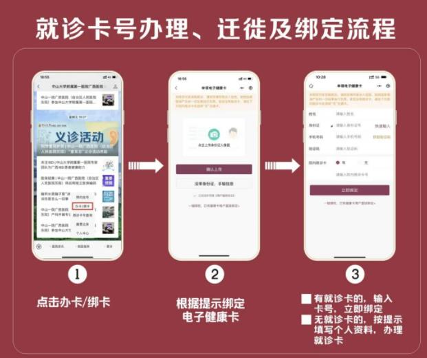 4、按照以下流程完成办卡/绑卡,便可根据需求选择医生或科室进行预约挂号。