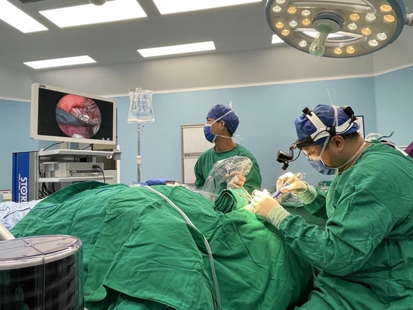 手术由耳鼻咽喉头颈外科嗓音组的谢华博士主刀。术前,房洁渝凭借多年的经验在可视喉镜下一次性插管成功,避免了气管切开,减轻了手术损伤及术后继发肺部感染的风险。插管成功之后,谢华使用等离子刀沿肿物的根蒂部,一点一点将肿物与周围组织边界安全分离,精准摘除患者双侧扁桃体肿物,手术历时40分钟,术中出血少于2ml,最大限度地保护了正常组织。