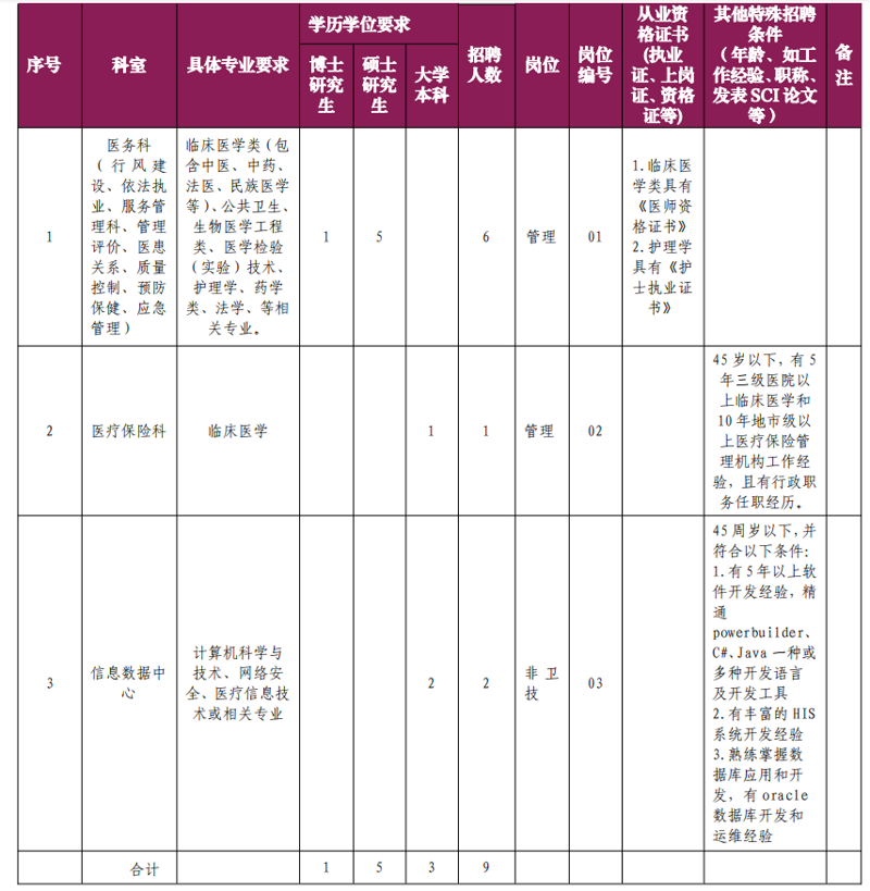 正在找工作的小伙伴注意啦,皇冠足球网-皇冠足球投注网 (简称皇冠足球网 )最新的招聘信息来了,根据医院发展需要,现面向社会招聘管理/非卫技岗人才9人,大家一起来看看吧!